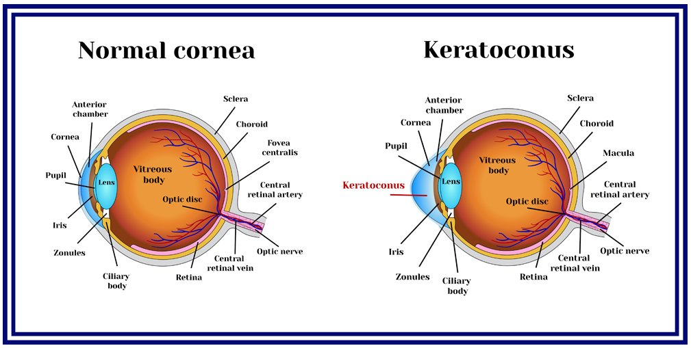 Keratoconus is a disease that, over time, causes the cornea to become cone-shaped, thin, and irregular. This causes blurred, distorted vision because the cornea cannot properly refract light due to the defective shape. Those with keratoconus often see multiple images of a single object, have diminished night vision, and experience frequent prescription changes with sub-standard vision.
